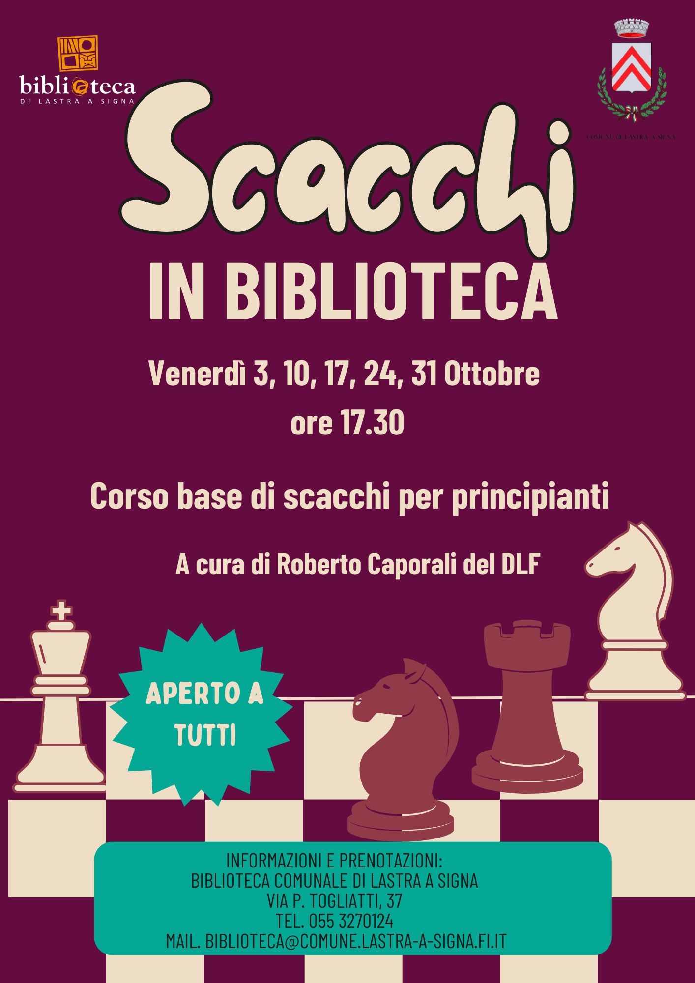 Corso base di scacchi per principianti a cura di Roberto Caporali del DLF , tutti i venerdì di Ottobre dal 3 al 31 dalle 17.30 alle 19.00
