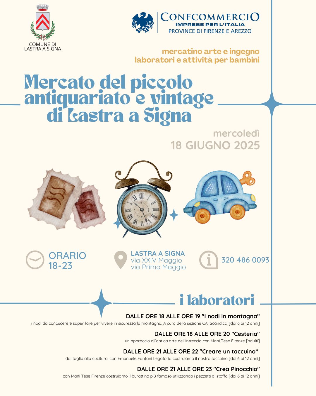 E mentre le vie del centro storico di Lastra a Signa si trasformeranno in una passeggiata nel ‘paese dei balocchi’, tra banchi di oggettistica, mobili d’epoca, collezionismo e curiosità vintage, in Via Primo Maggio ci saranno gli attesi laboratori di creatività: in particolare dalle ore 18 alle ore 19 “I nodi in montagna”:i nodi da conoscere e saper fare per vivere in sicurezza la montagna, a cura della sezione CAI Scandicci [dai 6 ai 12 anni], dalle 18 alle ore 20 “Cesteria”, un approccio all’antica arte dell’intreccio con Mani Tese Firenze [adulti], dalle ore 21 alle ore 22 “Creare un taccuino” dal taglio alla cucitura, con Emanuele Fanfani Legatoria costruiamo il nostro taccuino [dai 6 ai 12 anni] e dalle ore 21 alle ore 23 “Crea Pinocchio” con Mani Tese Firenze costruiamo il burattino più famoso utilizzando i pezzetti di stoffa [dai 6 ai 12 anni]. I laboratori sono promossi sempre in collaborazione con Confcommercio.