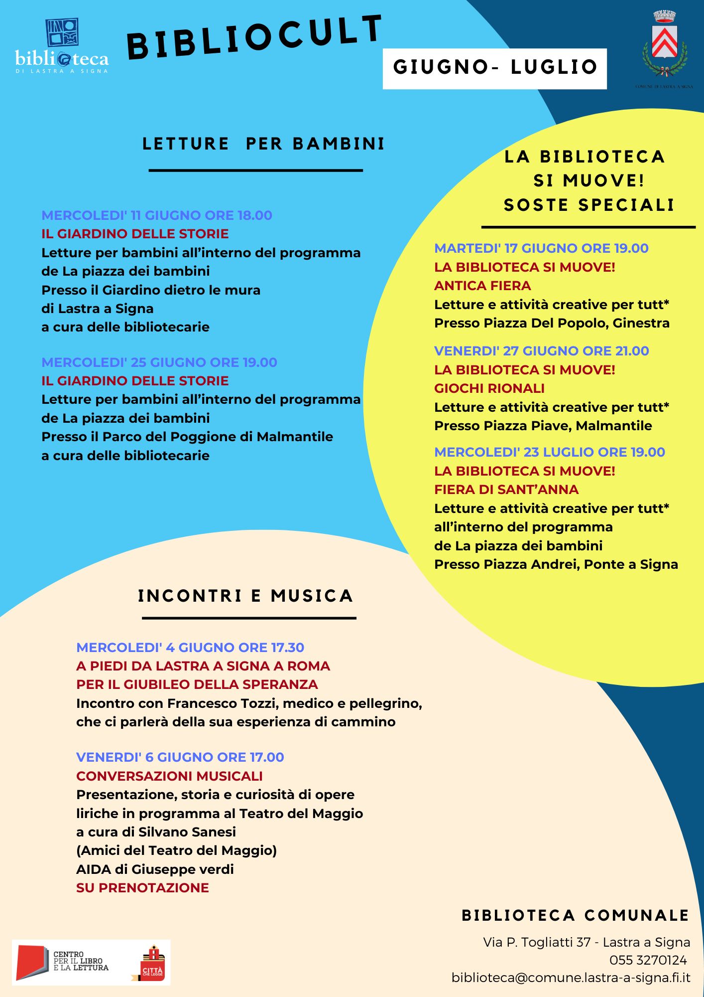 Proseguono alla biblioteca comunale di Lastra a Signa gli appuntamenti culturali del programma Bibliocult. Mercoledì 4 giugno alle 17.30 A piedi da Lastra a Signa a Roma per il Giubileo della speranza, incontro con Francesco Tozzi. Venerdì 6 giugno alle 17 tornano le conversazioni musicali sulle opere liriche in programma al Maggio Musicale Fiorentino a cura di Silvano Sanesi: in questo appuntamento si tratterà de l’Aida di Giuseppe Verdi.