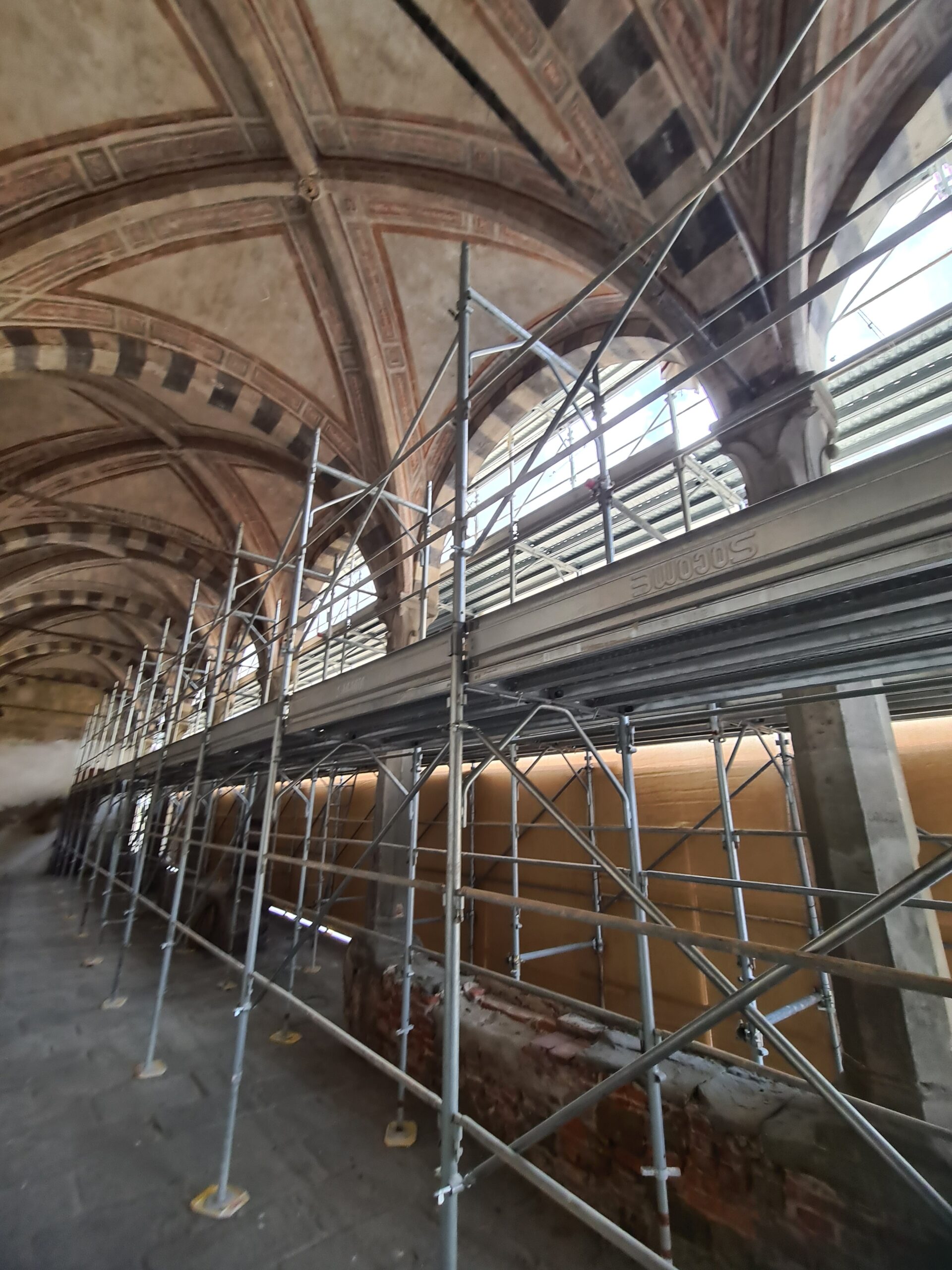 Per quanto riguarda l’avanzamento del cantiere in questo momento sono stati montati tutti i ponteggi perimetrali e si stanno svolgendo gli interventi propedeutici per le lavorazioni di restauro con l’effettuazione di saggi atti a mettere in sicurezza le decorazioni e le campionature di materiali da reperire e autorizzare per l’esecuzione dei lavori.