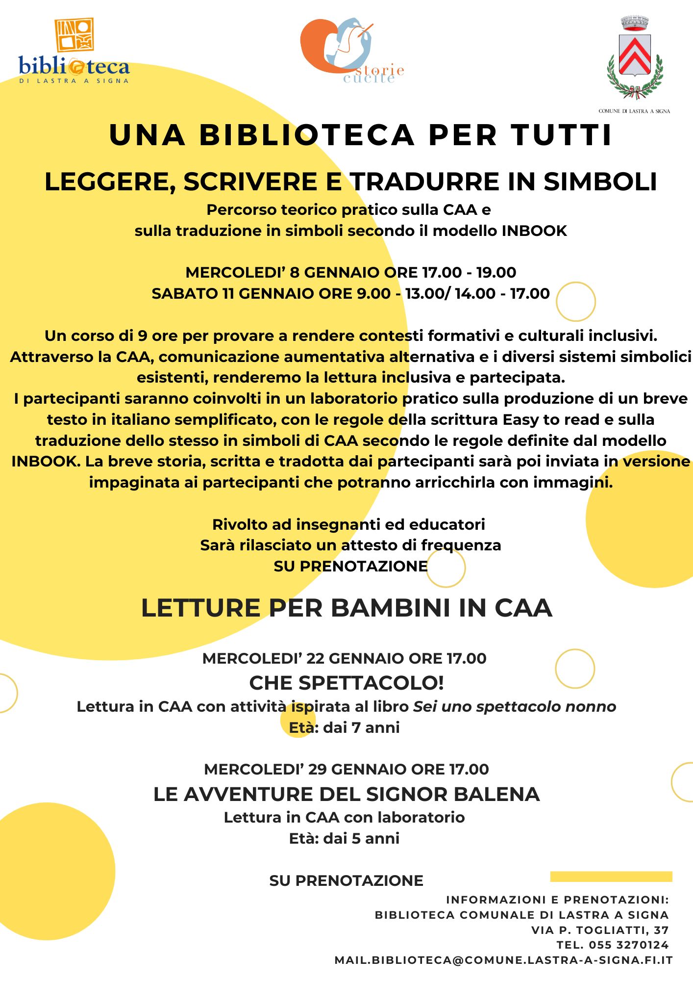 Mercoledì 22 gennaio alle 17 si terrà il laboratorio per bambini Che spettacolo! Con lettura in CAA e attività ispirata al libro Sei uno spettacolo nonno (dai 7 anni di età) e mercoledì 29 gennaio dalle 17 “Le avventure del signor balena” con letture in CAA e laboratorio (dai 5 anni).