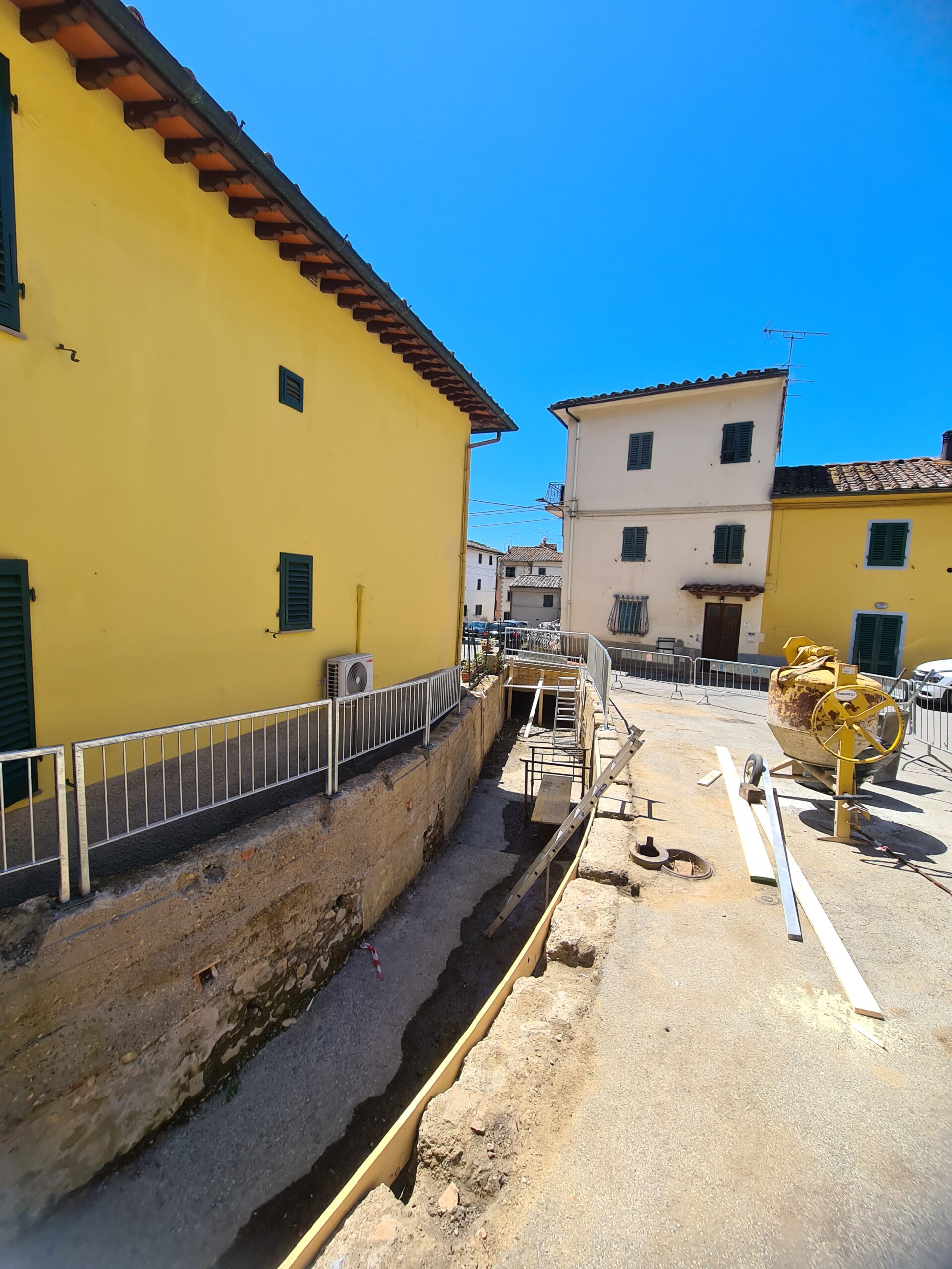 In particolare si sta procedendo alla stombatura del fosso che attraversa la piazzetta, il ripristino della soletta sul fondo del fosso e lateralmente, con il montaggio di una ringhiera a protezione della parte stombata tratto in cui è stata rimossa la soletta di chiusura.