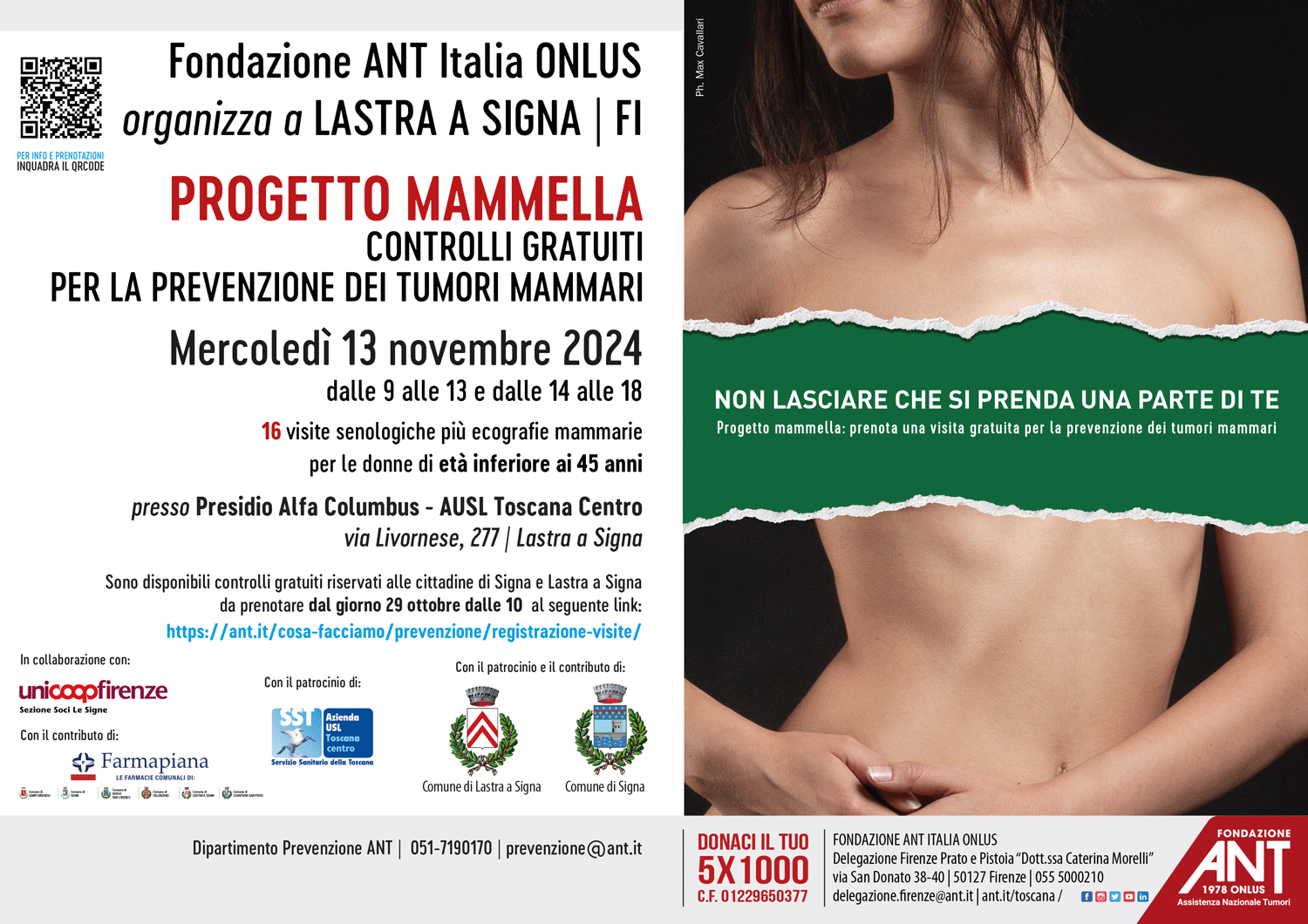 Grazie alla sinergia con vari soggetti del territorio, torna anche quest’anno il programma di prevenzione oncologica gratuita di Fondazione ANT a Lastra a Signa. Nello specifico saranno offerte ai cittadini dei Comuni di Lastra a Signa e Signa 48 visite dermatologiche gratuite di Progetto melanoma ANT e 16 visite gratuite di Progetto Mammella per le donne sotto i 45 anni.
