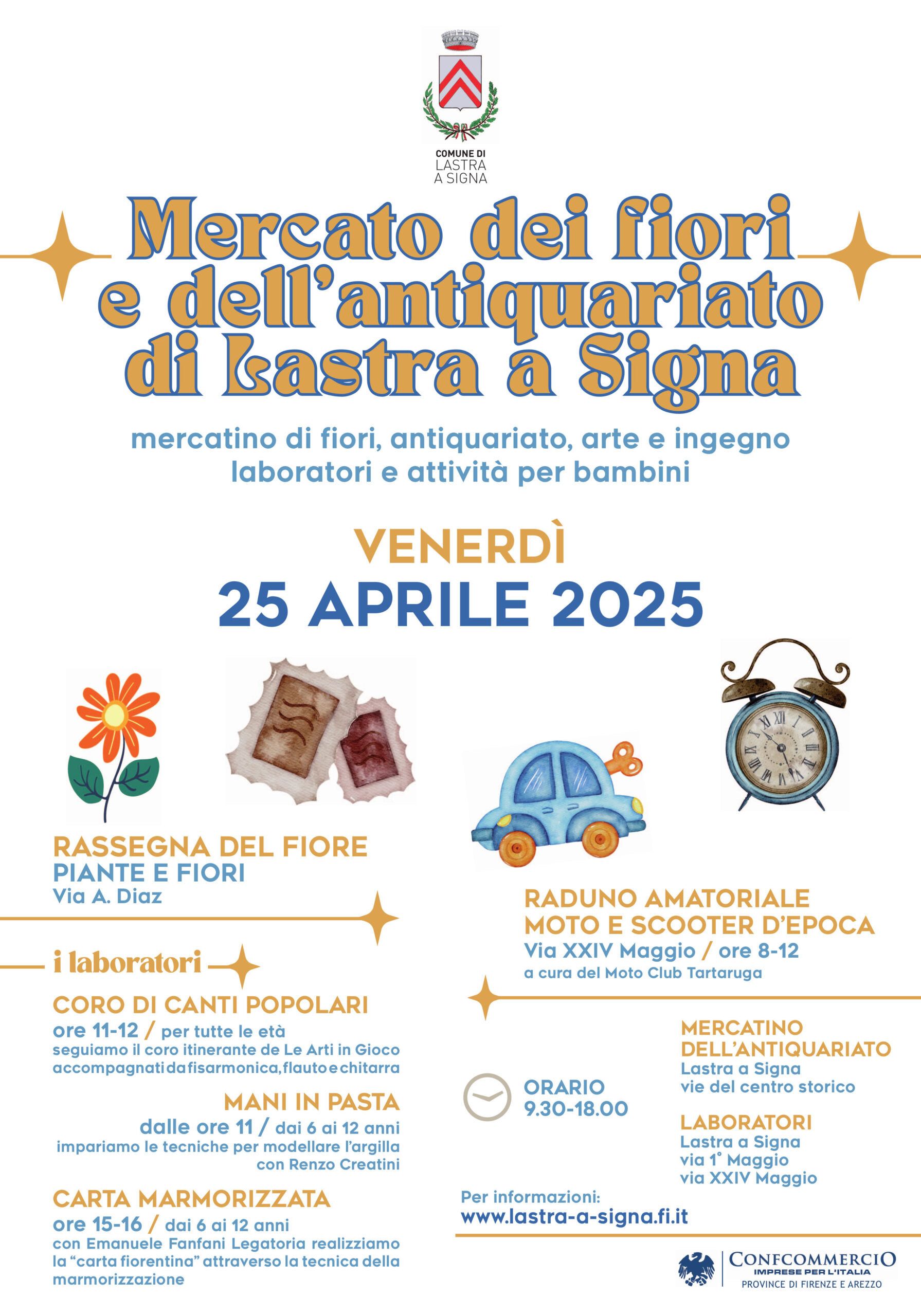 Il 25 aprile il centro storico di Lastra a Signa, e più precisamente via XXIV Maggio, via Primo Maggio e via Diaz, si animerà con eventi e iniziative grazie al mercato dell’antiquariato e il mercato dei fiori dalle 9.30 alle 18.